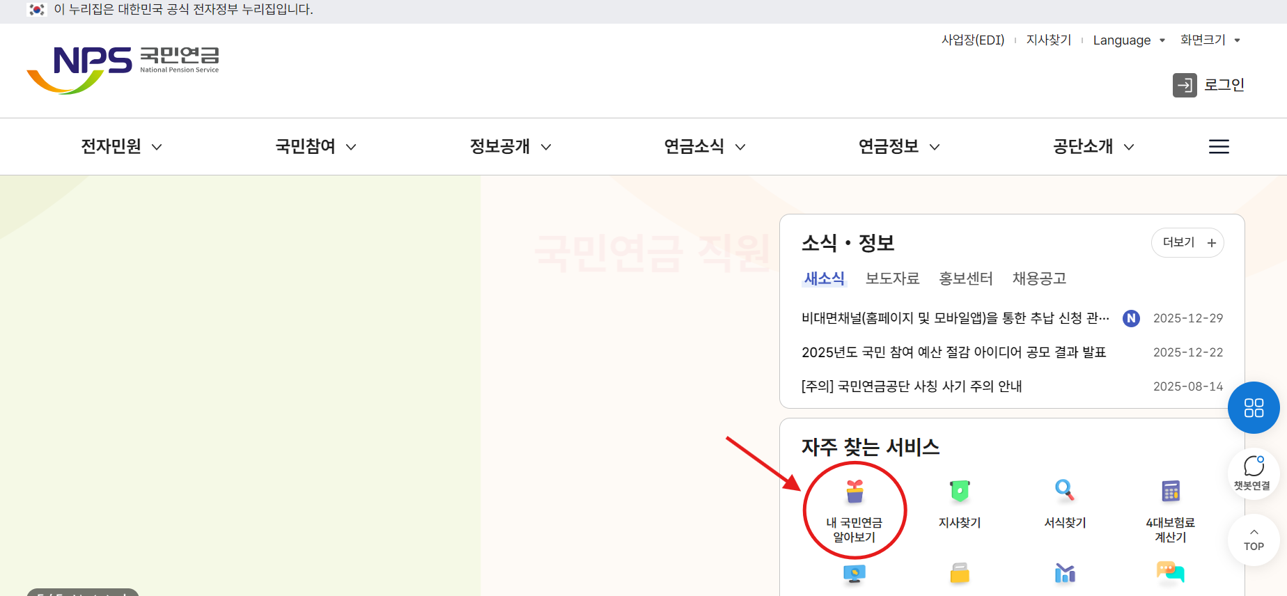 - 자주찾는서비스 → 내 국민연금 알아보기 선택